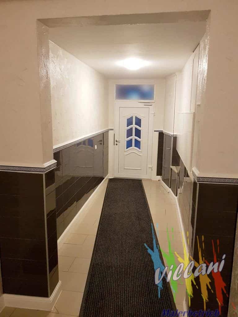 So haben wir die Wandflächen oberhalb des Sockels mit einem individuell gestalteten Putz versehen. Der Sockel wurde in einer strapazierfähigen Technik gearbeitet, welche je nach Lichteinfall, einen changierenden Effekt hat. Die Trennung von Sockel und Wandfläche haben wir mit einer Bordüre vorgenommen, welche wir abschließend zweifarbig gestaltet haben. Die Holzbauteile wie Türen, Geländer und Handlauf wurden aufgearbeitet und seidenglänzend lackiert. Der Boden und die Stufen haben einen neuen Belag aus Design Vinyl in Fliesen- / Steinoptik erhalten. Zusätzlichen wurden die Stufen mit Trittkanten versehen, welche zur Rutschhemmung und als sauberen Abschluss dienen. Der Boden und der Sockel des Eingangsbereiches wurden in zeitlosen Farben gefliest.